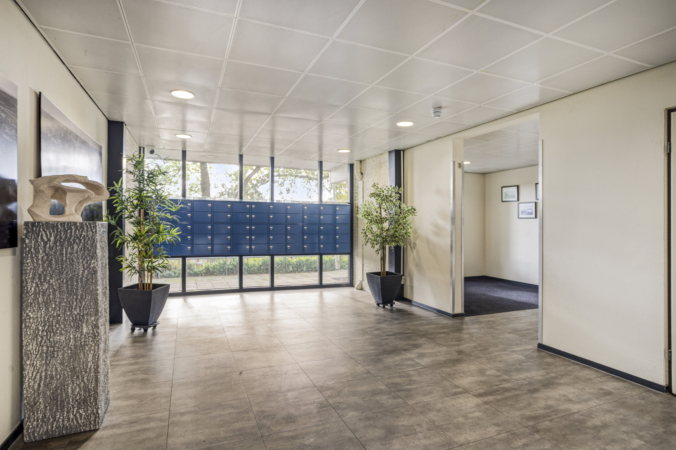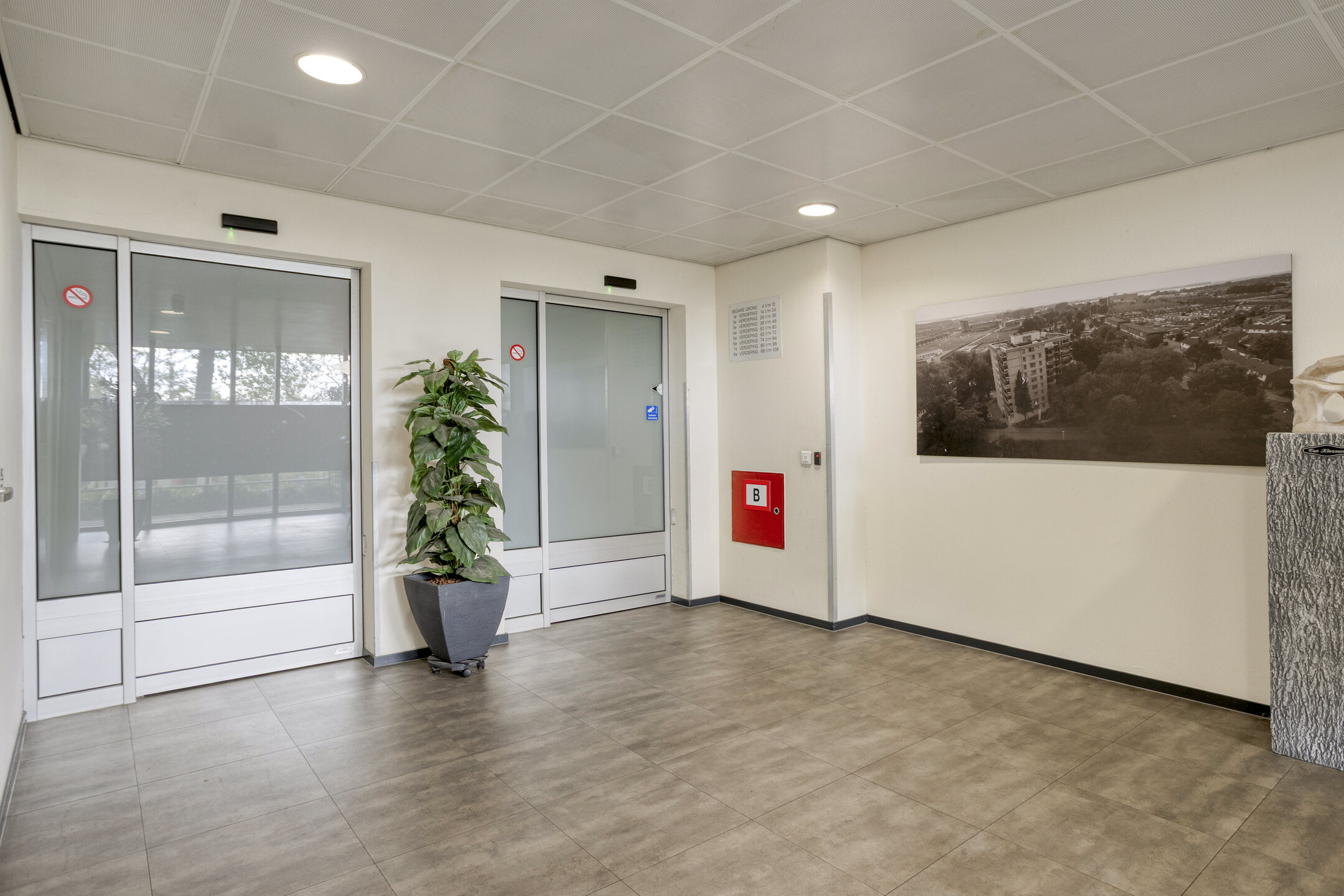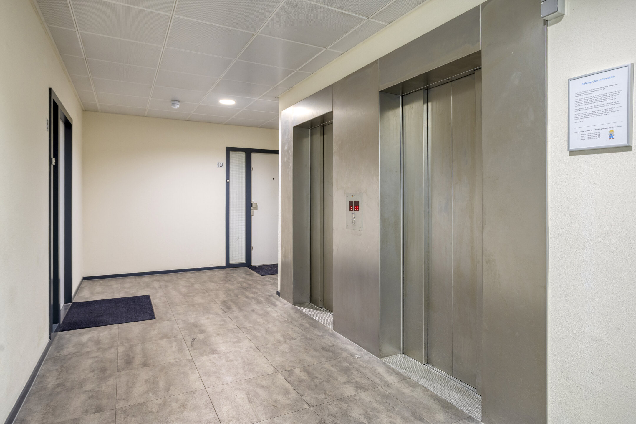 Algemene entree v.v. liftfaciliteit, trapopgang, brievenbussen en toegang tot de bergingen.