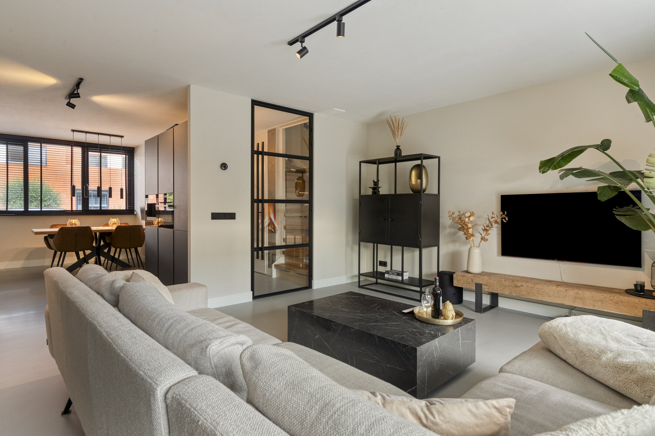 Aan de voorzijde van de woning bevindt zich de moderne keuken (2023), uitgerust met hoogwaardige inbouwapparatuur zoals een inductiekookplaat, afzuigkap, vaatwasser, combi-oven en ingebouwd koffieapparaat. De woonkamer ademt comfort, stijl en eigentijdse klasse, een heerlijke plek om thuis te komen.