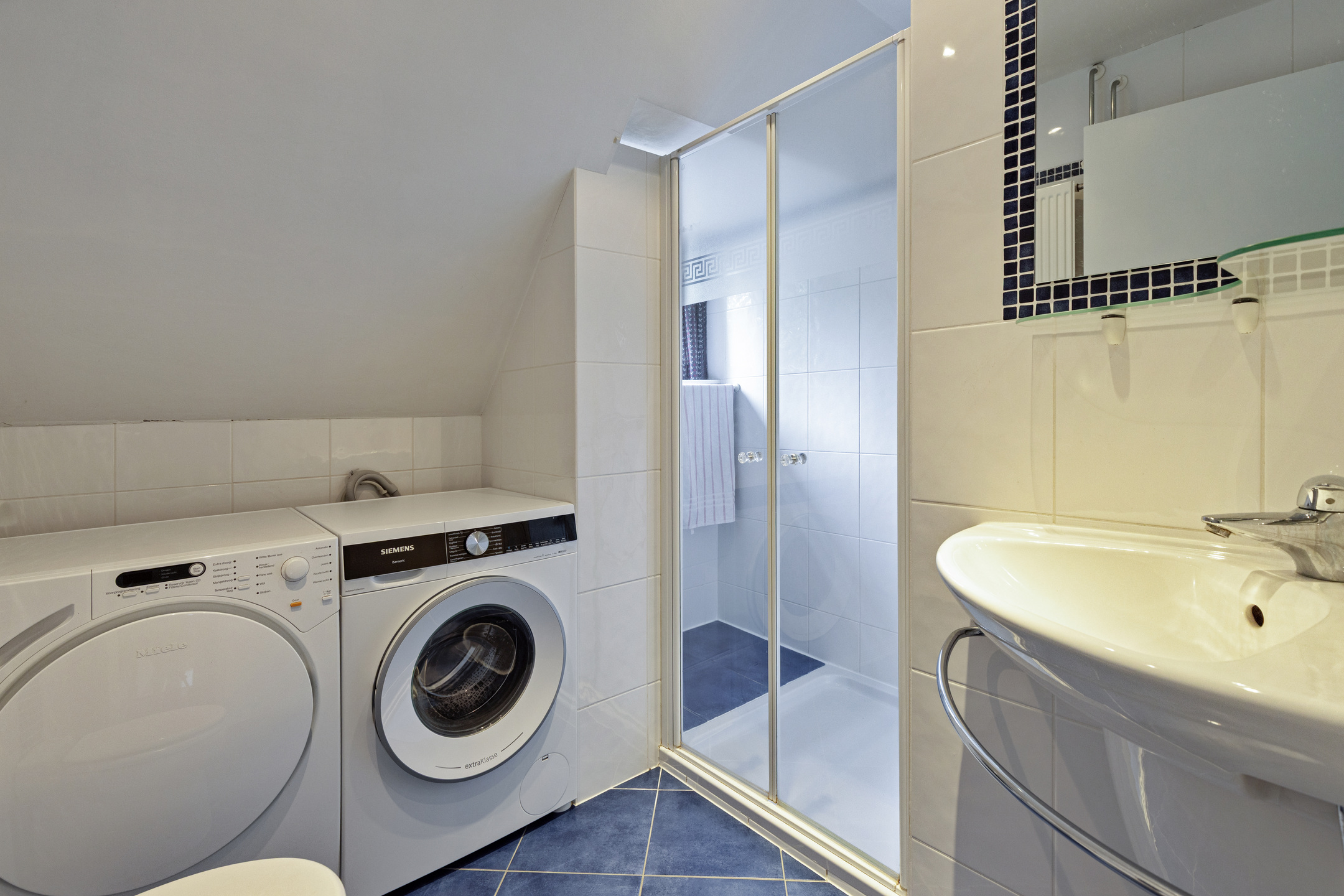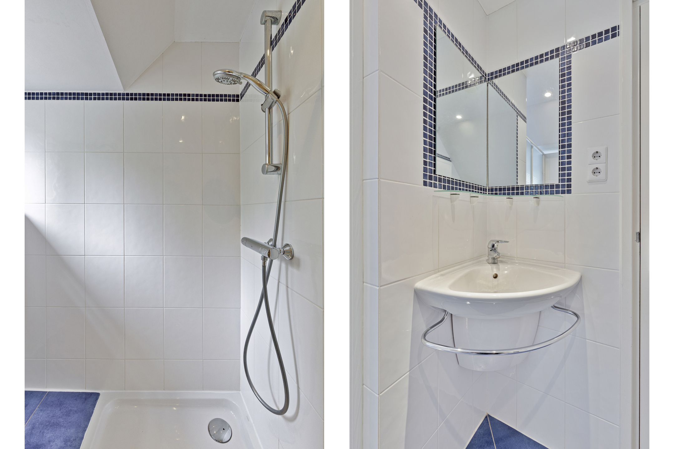 De overloop geeft toegang tot drie slaapkamers, waarvan één met een dakkapel aan de achterzijde. De badkamer is functioneel en voorzien van een douche, wastafel, toilet (sanibroyeur) en wasmachineaansluiting. De slaapkamers zijn afgewerkt met een combinatie van laminaat en vloerbedekking.