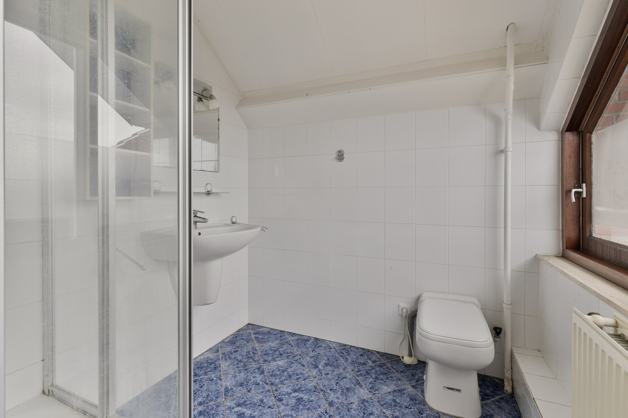 De overloop biedt toegang tot drie riante slaapkamers, een apart tweede toilet en een betegelde badkamer, uitgerust met een douchebad en wastafel. De badkamer beschikt over een directe toegang tot een compact balkon. De eerste verdieping is afgewerkt met een vinylvloer en een plafond afgewerkt met gipsplaten.