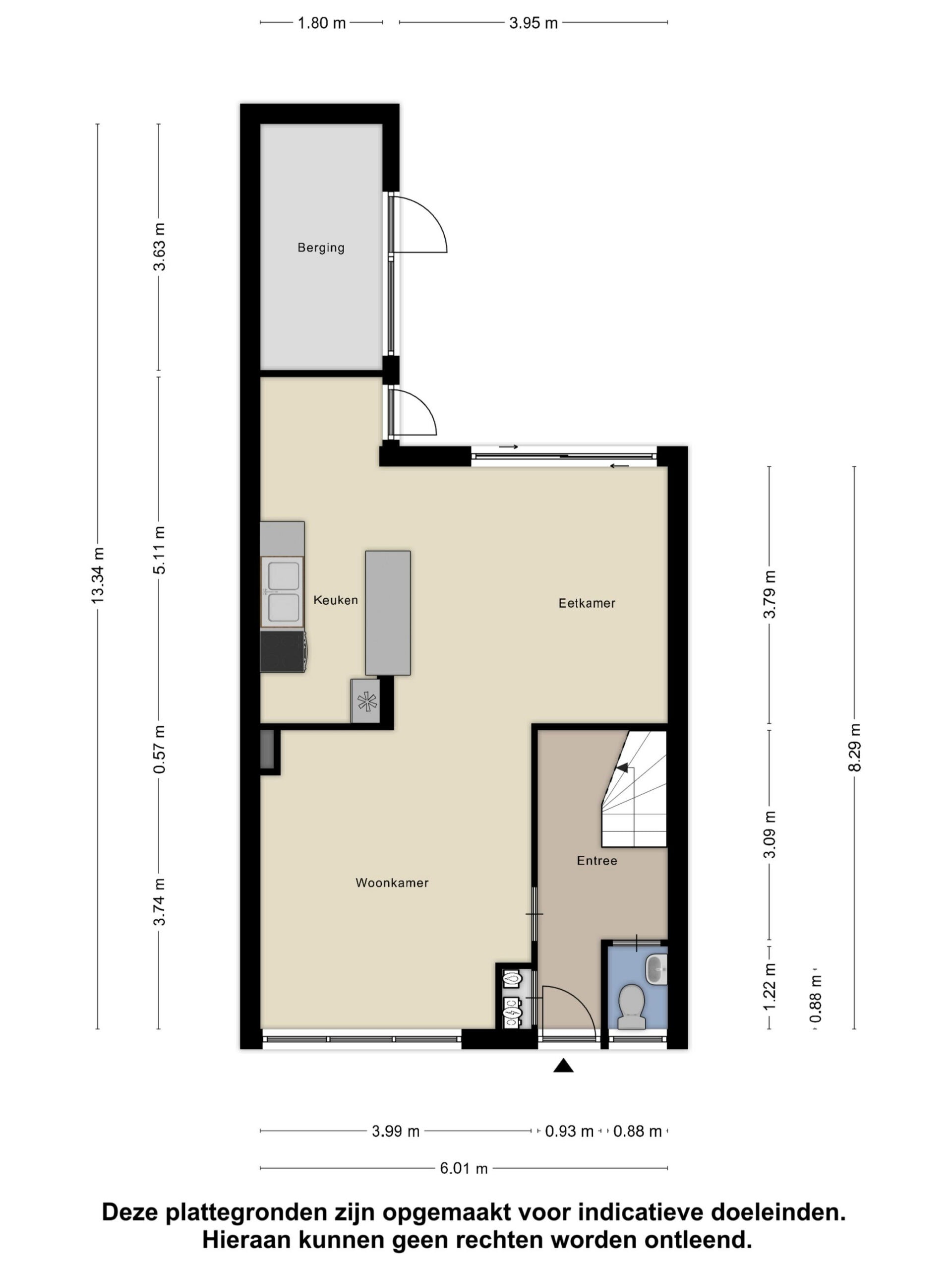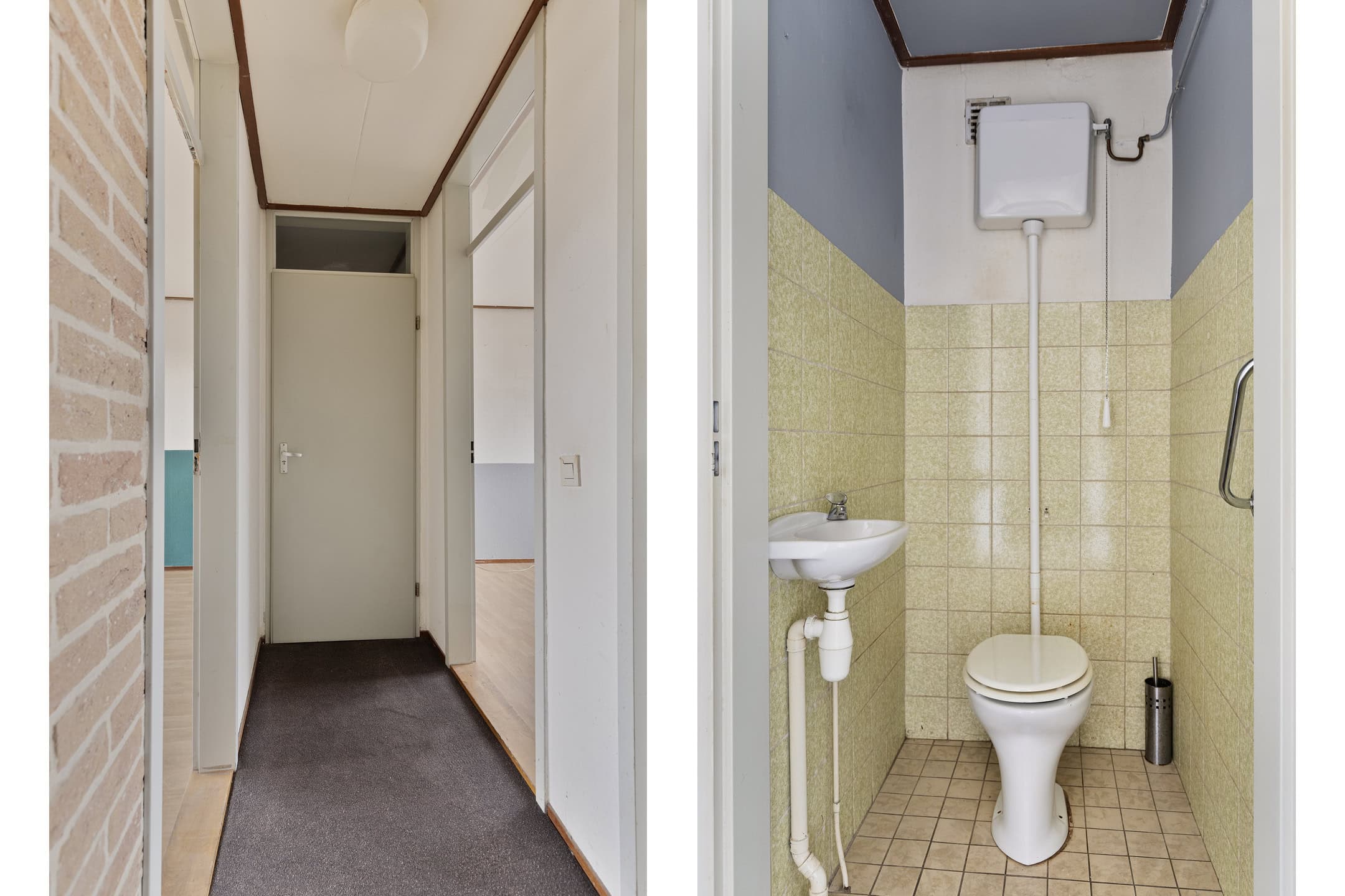 Bij binnenkomst in de hal/entree vindt u de meterkast (v.v. 7 groepen, 1 kookgroep en 2 aardlekschakelaars) en een betegeld toilet. Vanuit de hal/entree heeft u toegang tot de lichte woon- en eetkamer, waar de raampartijen zorgen voor een aangename hoeveelheid natuurlijk daglicht. De woon- en eetkamer staat in verbinding met de open keuken. De aangrenzende keuken is eenvoudig uitgevoerd, zonder inbouwapparatuur, maar biedt voldoende ruimte om eventueel een moderne keuken te realiseren. Direct naast de keuken bevindt zich een praktische berging met wasmachineaansluiting, welke te bereiken is via de tuin. Deze ruimte is ideaal voor extra opbergruimte en als opstelplaats van de wasmachine en droger.